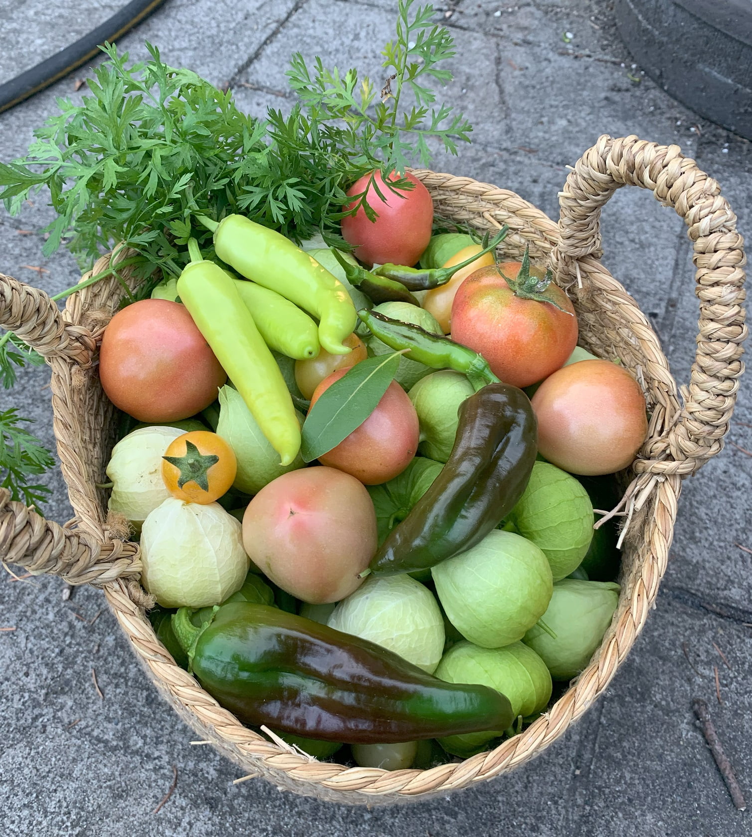 A woven basket full of an assortment of freshly picked peppers.