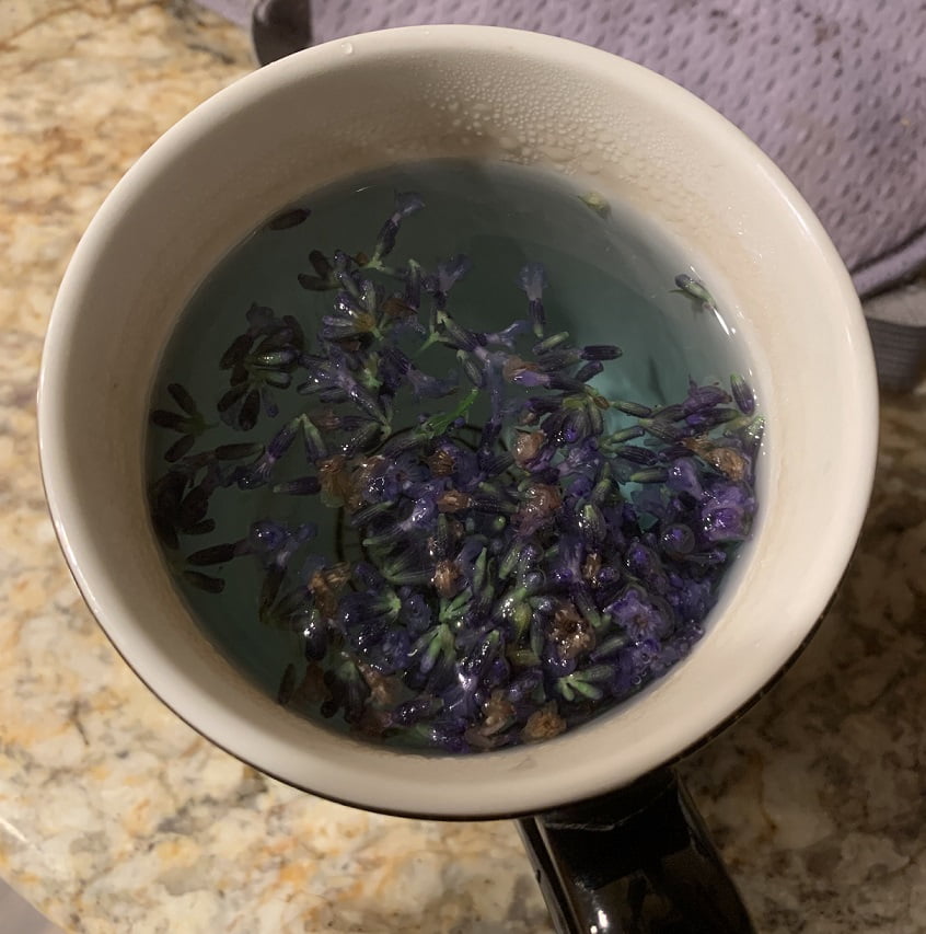 Luckily for me, my lavender plant is still putting out fresh blossoms every day. I went out into the dark with my headlamp and gathered enough for a nice cuppa.
